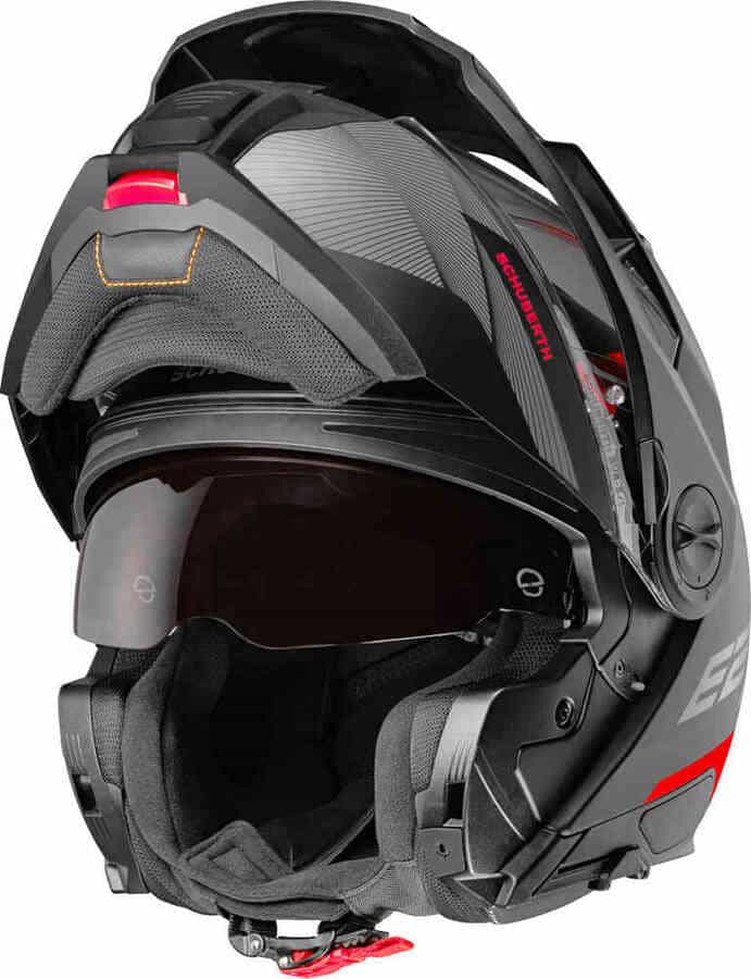 - El Schuberth E2 viene equipado con un nuevo sistema de cierre micrométrico fabricado en plástico reforzado con fibra de vidrio para reducir el peso y mejorar el manejo.